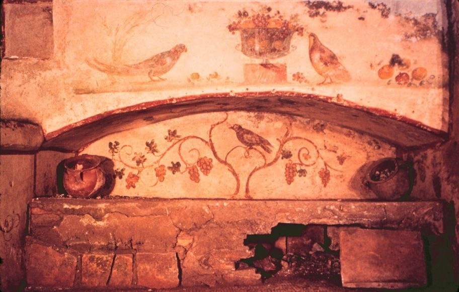 Древнехристианские художники с особой тщательностью разрабатывали эту тему, создавая сложные композиции, где каждая деталь имела символическое значение. Часто изображалась не просто лоза, но виноградные гроздья с птицами, клюющими ягоды. Яркий пример - фреска в крипте Люцины, где два голубя прикасаются к виноградной кисти. В этом образе святые отцы видели указание на таинство Евхаристии, где верные, подобно птицам, питаются от истинной Лозы - Христа,