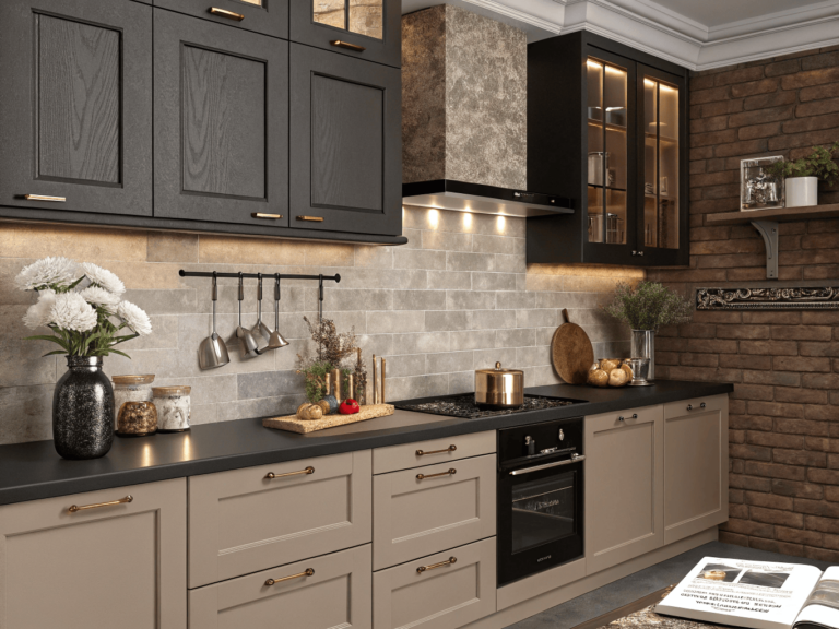 Бежевый: смягчает строгость черного. Бежевый — это теплый обнимающий акцент, который делает черный менее строгим. Бежевая столешница или деревянные элементы в сочетании с черными фасадами создают уютную и гармоничную атмосферу.