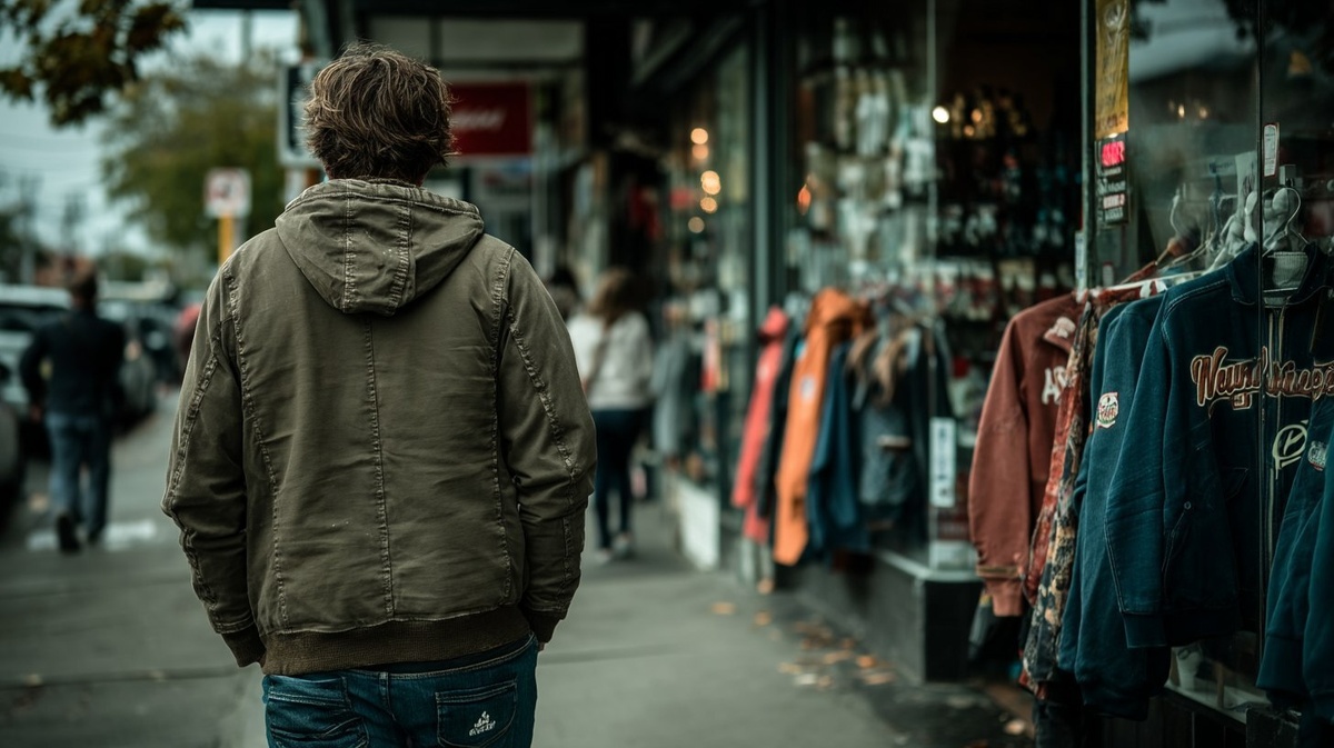 Создано на основе запроса: a realistic adult person, young male 20 year old , seen from behind, walking and looking at a store , facing a