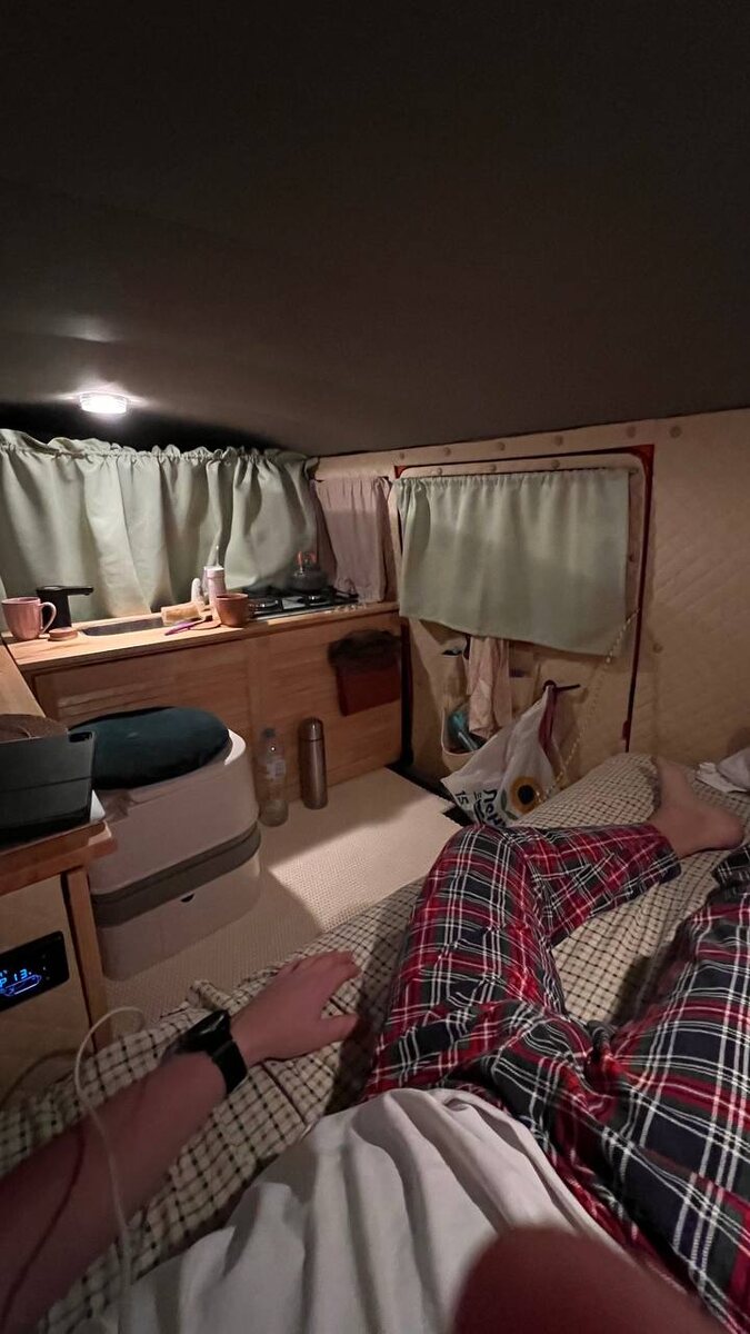 Первая ночь в Грузии 🇬🇪. Восхитительно! На основную камеру снял перевал — в фильме будут просто умопомрачительные кадры! Уровень снега поражает ❄️, противолавинные тоннели будоражат, а горы 🏔️ завораживают так, что дух захватывает. Ну и конечно — стоянка на природе в завершение дня… Идеальное стечение обстоятельств! Хочу поделиться впечатлением о Буханочке: Это идеальный автомобиль для путешествий одному или вдвоем — и не только по России! Неубиваемая подвеска прощает всё: и ямы Тамбовской области 😆, и бесконечную стиральную доску Алтайских грунтовок. На перевале после границы ямы попадались просто ужасающие… Парочку пропустил — думал конец колесам. Но Буханка их просто проглотила! Удивился сам. Про салон сейчас подробно писать не буду, скажу только: я в шоке, как круто получилось всё сделать своими руками! Так что рекомендую: если цель — путешествия, а не переживания о запчастях и ремонте — Буханка топчик! Для России — вообще бомба! 💣