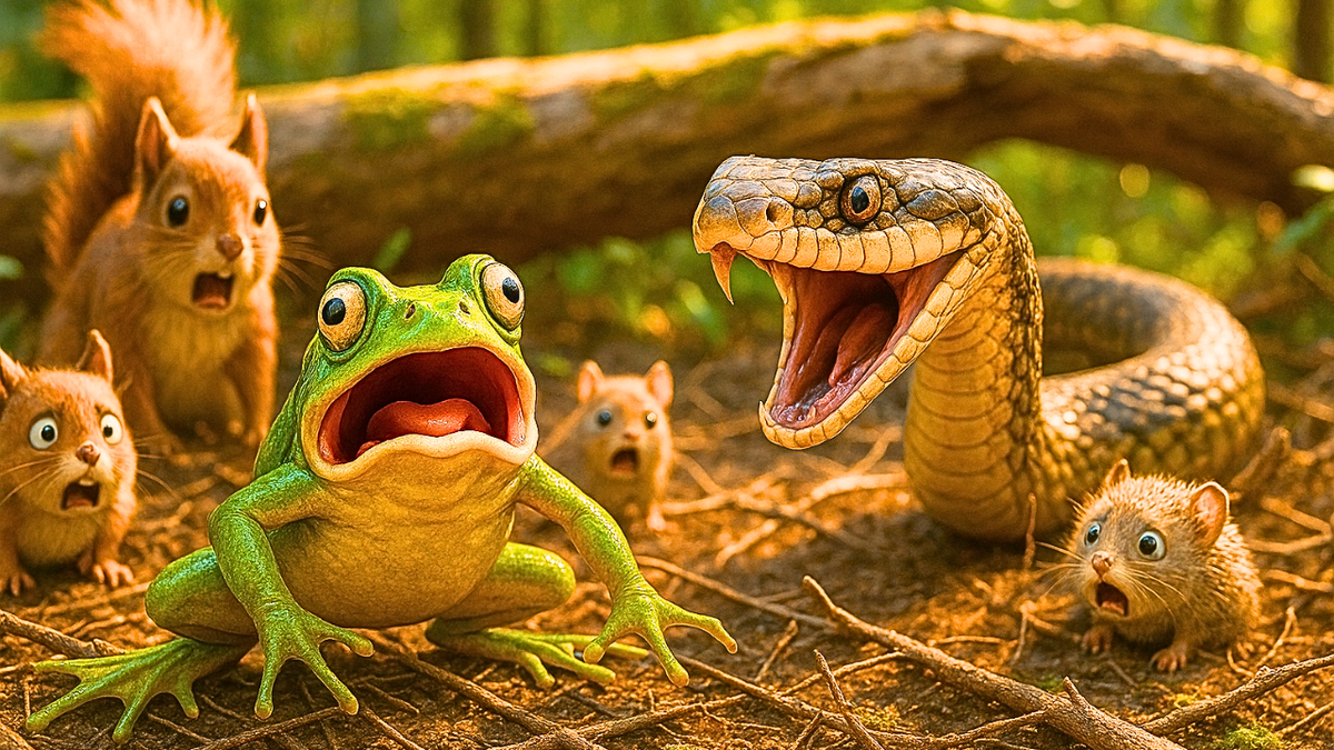 В одном солнечном лесу жила-была змея. И была она настолько злая, что даже мыши шептались про неё, дрожа от страха. Всё, что шевелилось — змея мечтала съесть. Однажды выползла она на охоту, шипя да оглядываясь по сторонам в поисках чего-нибудь повкуснее. И вдруг увидела странную картину: прямо посреди тропинки в сухих ветках застряла зелёная лягушка. Бедная извивалась, барахталась, но без толку — ветки держали её мёртвой хваткой. Змея радостно прищурилась. — Вот удача! — зашипела она, медленно подползая. — Даже охотиться не надо: обед сам в ловушку залез! Она широко раскрыла пасть, но в этот момент лягушка, испуганно заморгав, крикнула: — Подожди змеюка! Не ешь меня сразу! Освободи меня сначала из этой ужасной ловушки, а потом ешь сколько тебе влезет! Змея скосила глаз: — Хитрая ты зелёная клякса. Думаешь, я такая глупая? Освобожу тебя, а ты — дёру! — Честное квакушачье! — взвизгнула лягушка. — Я останусь! Освободи меня — и ты заслужишь законный обед! Змея задумалась. С одной стороны —