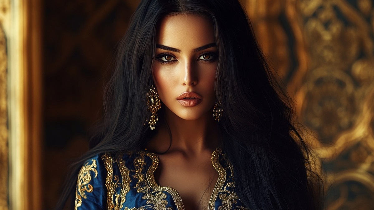 Создано на основе запроса: A breathtakingly elegant Middle Eastern woman, long flowing black hair, golden sun-kissed skin, wearing a