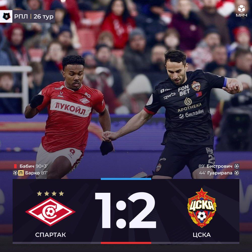 Фанастическая, можно даже сказать драматическая развязка в дерби "Спартак" - ЦСКА!!!🔥🔥🔥 Армейцы открыли счет в концовке первого тайма, отличился Гуарирапа. "Красно-белым", чтобы сравнять счет, потребовалось вмешательство ВАР, определившего игру рукой в своей штрафной у Абдулкадырова. Барко реализовал пенальти на 87-ой. Как ответил ЦСКА? Мгновенной атакой с точным ударом Бистровича в касание на 89-ой! Первый гол Бистровича в сезоне стал для армейцев победным в дерби 2:1! ЦСКА не проигрывает во второй половине чемпионата, обгоняет "Спартак" и поднимается на чистое третье место в турнирной таблице за четыре тура до конца🔥🔥