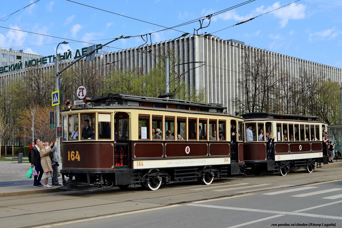 19 апреля сего года в честь 126-летнего юбилея трамвайного движения в Москве состоялся традиционный парад трамваев. Участвовало 11 машин (Ф+Н, КМ+КП, КТМ/КТП-1, МТВ-82, РВЗ-6, Татра Т2, Татра Т3, Татра Т7Б5, 71-608КМ, ЛМ-2000, Татра KT3R), меньше чем в прошлые года, но зато в первый раз показали публике "Кобру". 1. Ф (№ 164) + Н (№ 1113)