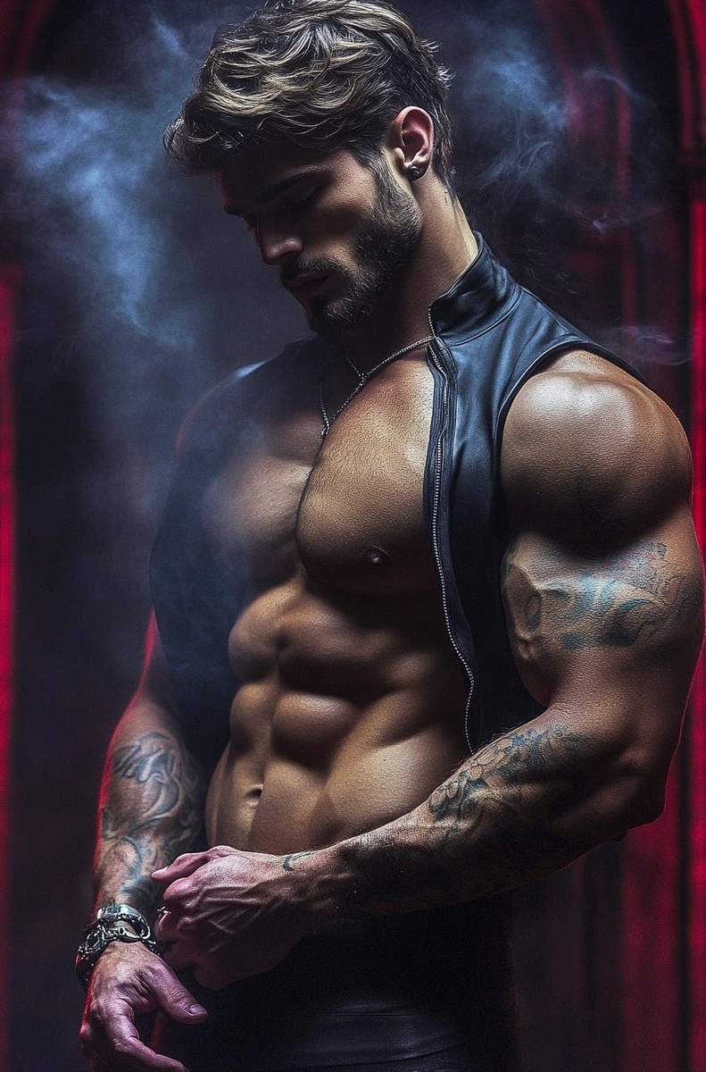 Создано на основе запроса: man, abs, tribal tattoos, dark blond hair, is in a dark, fantasy-style gothic room. The photo shows an attractive guy in a romantic pose. There's a kind of mist around him, giving him an air of mystery, a paranormal romance. Posted on Snapchat in 2018.
