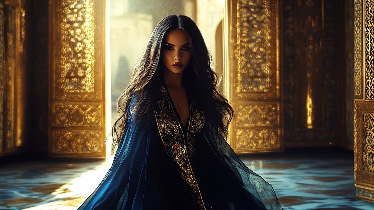 Создано на основе запроса: A regal woman in a flowing black and deep blue gown stepping into a grand, luxurious Arabian marble hall, golden
