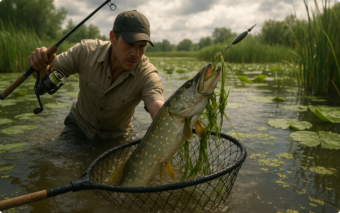 Лучший ориентир: трава + глубина 0,5–1,5 м = щука рядом.