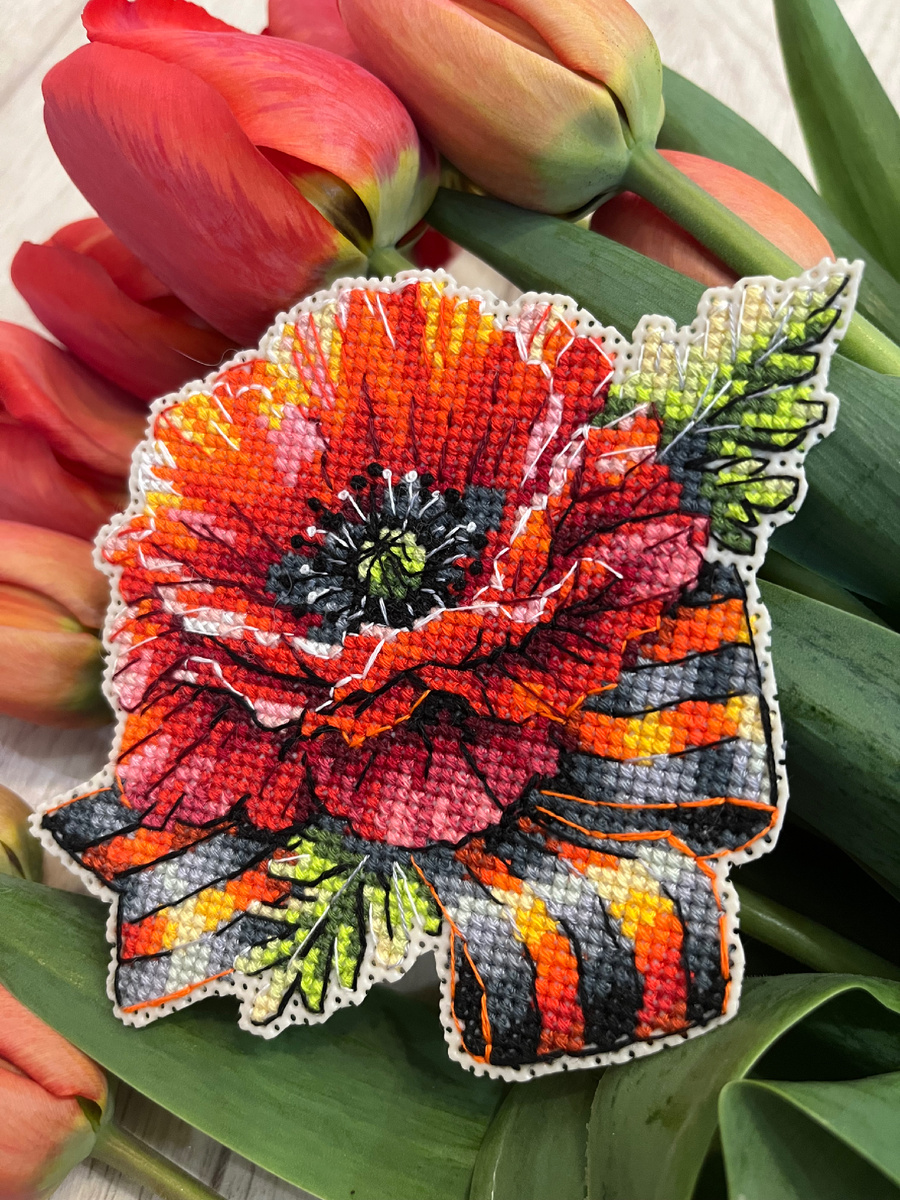 И вот сразу, сразу показываю эту красоту! Как же мне нравится этот мак😍. Ну а теперь коротко о том, куда я пропала и о вышивке тоже). В группе ВК funny_stitch проходит бесплатный совместный отшив к 80 летию Победы. Я не сама нахожу все эти СО, честно). Меня или носом туда ткнут (есть добрые люди))) или я случайно туда вляпаюсь, сама не понимаю, как). К Дню Победы я никогда ничего не вышивала, только делала броши много лет. Такие и много других на тему 9 мая. Всегда разбирают быстро, и в магазине, и через соцсети. Примерно после нового года я делала броши беспрерывно). В этом году, с закрытием магазина, я решила распродать оставшиеся броши и наконец уже что-то тематическое вышить. И вот). Не все схемы мне понравились по проработке, но есть вполне достойные, выбрать было из чего. Мимо мака я никак не могла пройти)) Вышивать я решила на бежевой пластиковой канве, в запасах как раз такая оказалась. Мулине здесь ДМС и несколько цветов какого-то китайского аналога. Схема очень проста