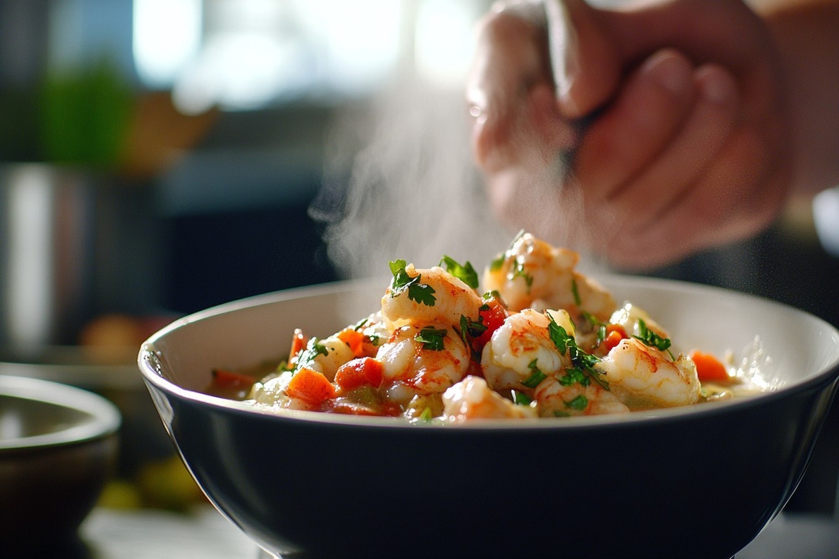 Создано на основе запроса: Title: Smoky Chipotle Shrimp Chowder | STYLE: Close-up Shot right view | EMOTION: realistic as possible | SCENE: KEYWORD | TAGS: High-end food photography, clear composition, mouth-watering, indulgent, gourmet, cuisine, recipe | CAMERA: Nikon Z7 | FOCAL LENGHT: soft direction light | PRODUCTION : food stylist | TIME : daytime | LOCATION TYPE : kitchen near windows,