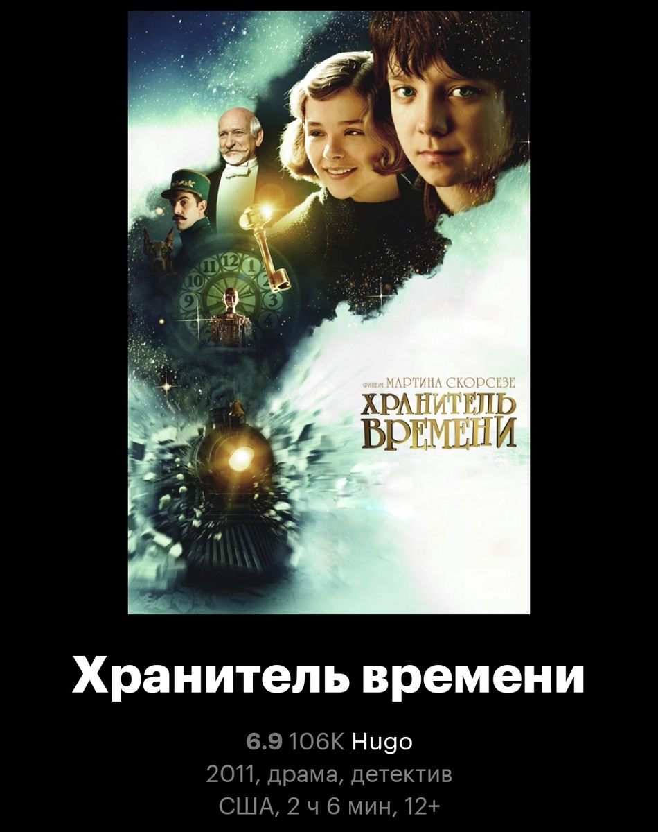 Мартин Скорсезе один из моих любимых режиссёров, а "Хранитель времени" в моём личном топе. И поэтому сегодня он будет в рубрике кино на выходные. Большая часть фильма проходит на вокзале Монпарнас в Париже. Главный герой - Хьюго, мальчик, потерявший родителей и живущий с дядей-часовщиком на вокзале. Хьюго пытается починить автоматон - кукла с механическим приводом, выполняющая действия по заданной программе, который достался ему от отца. Чтобы починить его он крадёт детали в магазине игрушек, но его ловит за этим занятием хозяин магазина. И теперь Хьюго должен помогать ему в магазине. Благодаря этой краже мальчик познакомится с девочкой Изабель, починит автоматона и узнает тайну хозяина магазина, который окажется одним из первых режиссёров в истории кинематографа - Жоржом Мельесом. Фильм очень красивый и снят великолепно. А что самое интересное так это то, что он рассказывает историю режиссёра Жоржа Мельеса, который считается основоположником кинематографа и изобретателем первых ки
