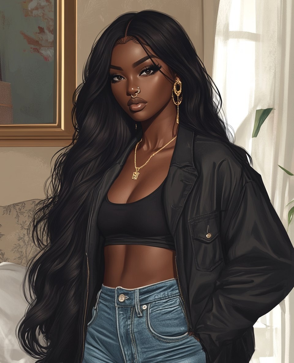 Создано на основе запроса: A Black woman with a long, body-wave lace front wig stands in her bedroom next to the mirror, wearing jeans and a