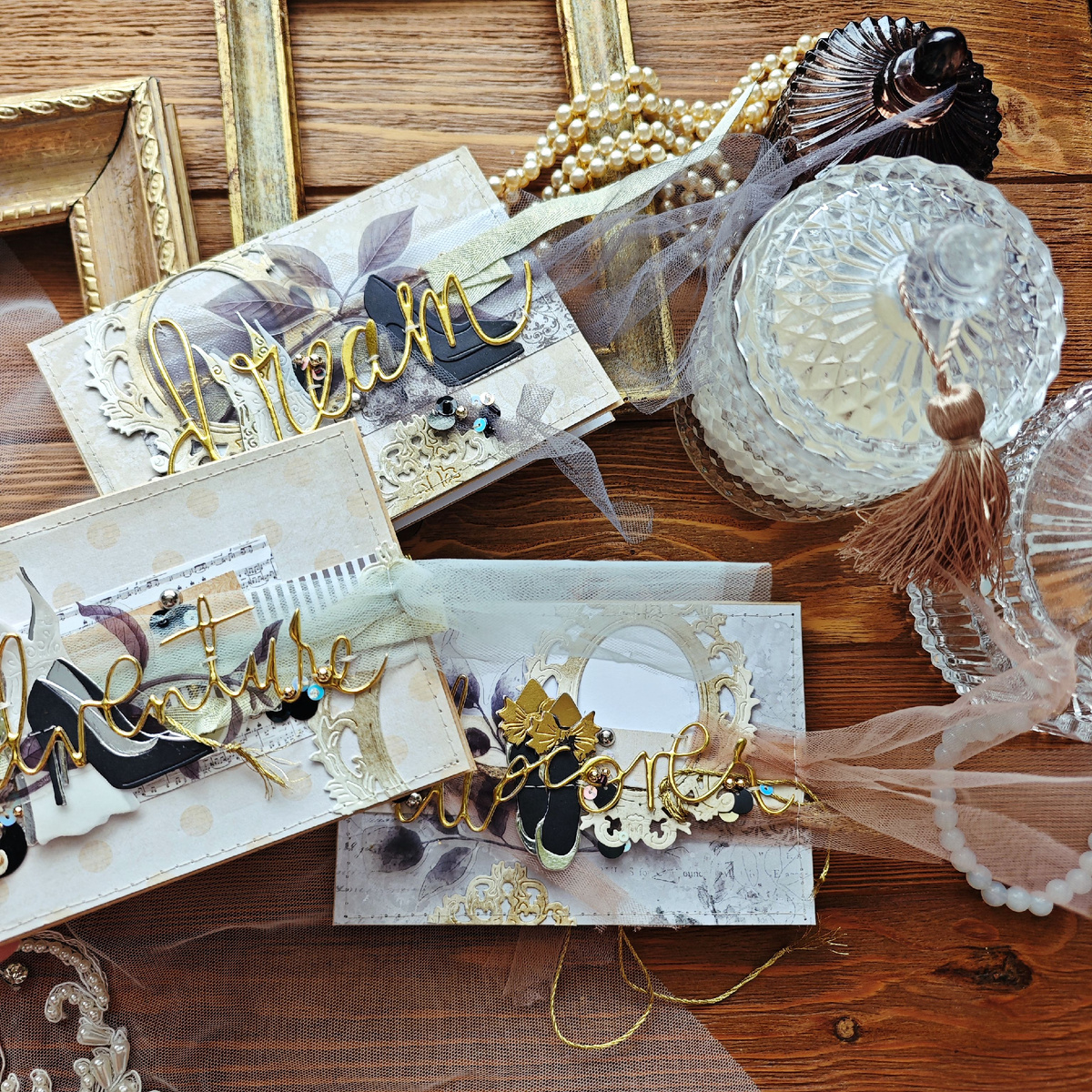 В этом месяце я, Анна Кадырджи, была на супер крутом мероприятии по продвижению скрапбукинга))). Шучу, это был трейдерский лагерь, но я приехала туда с этими красотками в подарок экспертам. А моя скрап-подруга верно подметила, что я параллельно занималась продвижением нашего хобби: )). И действительно, девочки восхищались, обсуждали и расспрашивали о хобби. Тема нашей финальной вечеринки была Лос-анджелес. Решено было делать открытки в этой теме, но сложно представлялся их будущей образ. Как только я достала набор ножей "Для всей семьи" и вырубила чёрные лодочки на шпильке, всё начало складываться. Какие же они изящные! Оставалось добавить наше легендарное платье из набора "...и моего коснулась платья" и понеслась душа на самую роскошную вечеринку. Только перед выходом надо взглянуть на себя красивую в зеркало "Ореховые рамы у зеркал" ;).