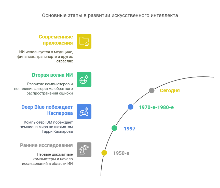 Исследования в области искусственного интеллекта начались в 1950-х годах. Одним из первых успехов стал шахматный компьютер, созданный в 1950-х годах. Одним из ключевых моментов стала игра IBM против Гарри Каспарова в 1997 году, когда компьютер Deep Blue победил чемпиона мира по шахматам.