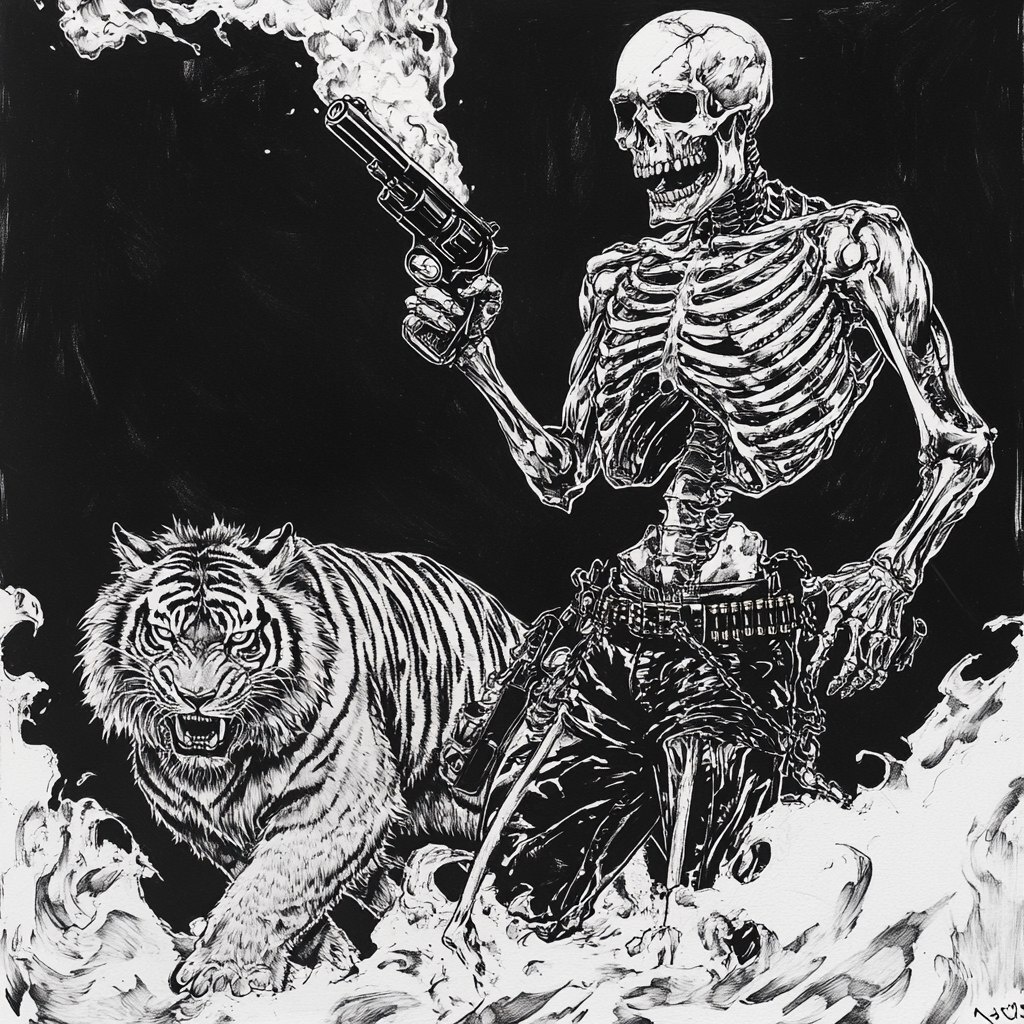 Создано на основе запроса: A muscular skeleton warrior standing victorious after battle, holding a smoking revolver, a majestic tiger