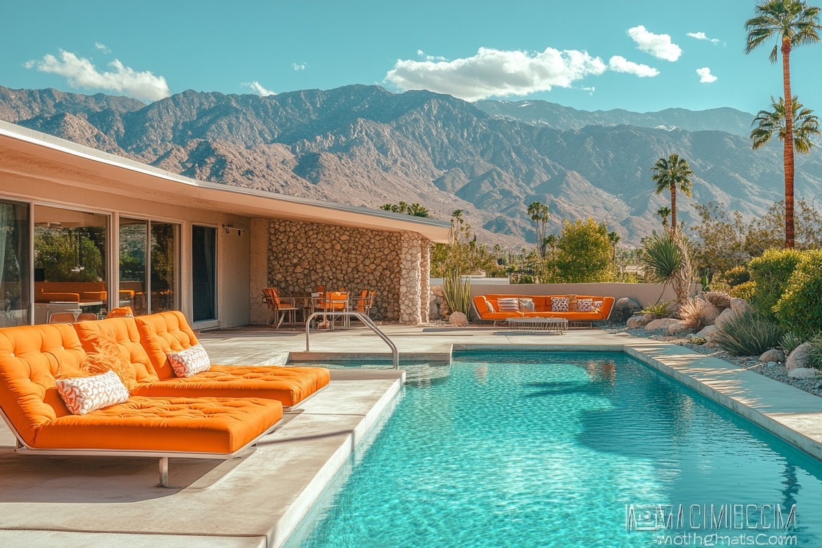 Создано на основе запроса: A mid-century modern house in Palm Springs, with a swimming pool and orange furniture outside