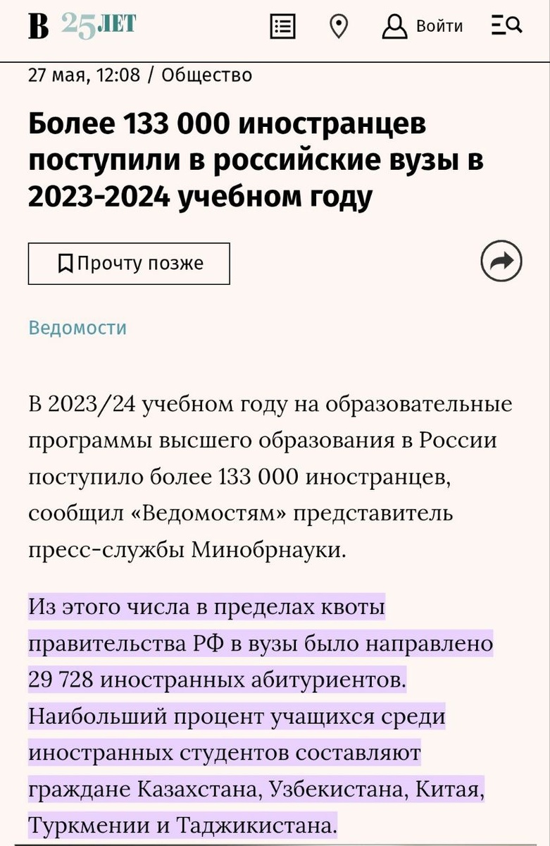 В ответ на пост Мне одна подписчица предъявила, что я, де, бред несу. Что якобы за иностранных студентов граждане России не платят и вообще среднеазиатов у нас мало учится. Специально не поленился и нашёл матчасть. Один скрин - это ст. ФЗ от 29.12.2012 "Об образовании в Российской Федерации", а второй - это материал "Ведомостей". ЛИ́НДРЕ 🫧