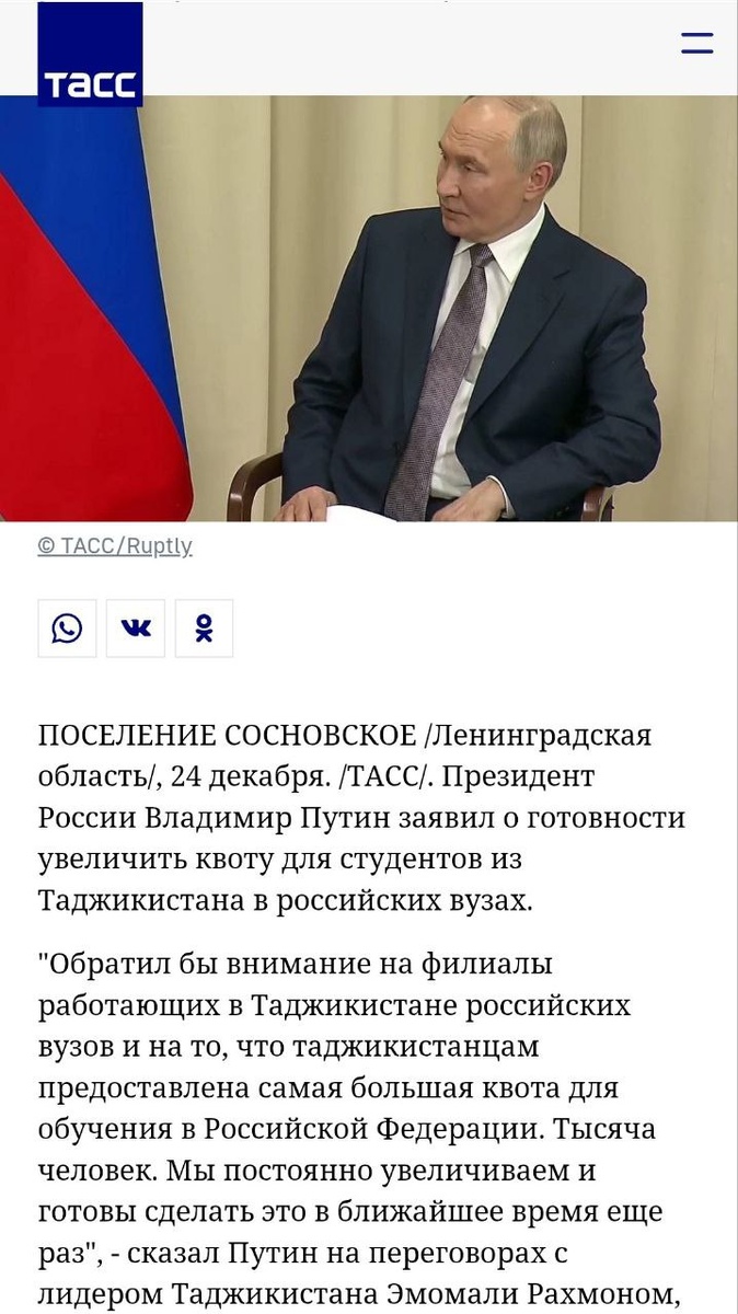 "Обратил бы внимание на филиалы работающих в Таджикистане российских вузов и на то, что таджикистанцам предоставлена самая большая квота для обучения в Российской Федерации. Тысяча человек. Мы постоянно увеличиваем и готовы сделать это в ближайшее время еще раз", - сказал Путин на переговорах с лидером Таджикистана Эмомали Рахмоном" (с) ЛИ́НДРЕ 🫧
