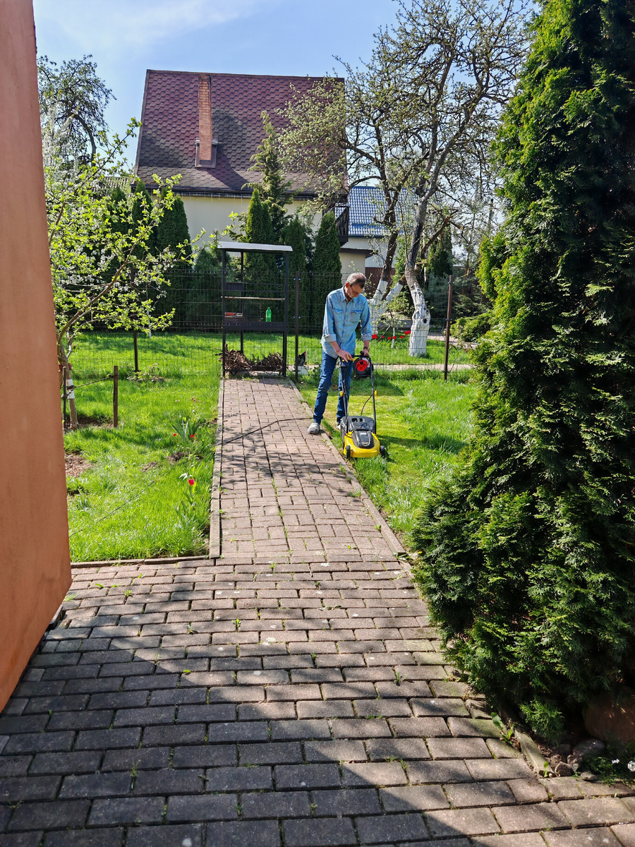 Про глаз с него не спускаю. Лучше бы действительно так делала. У меня только тюльпаны заколосились, жду когда они раскроются, а садовод мой пошел косить траву. Лужайку выкосил, но в труднодоступных местах осталась трава.