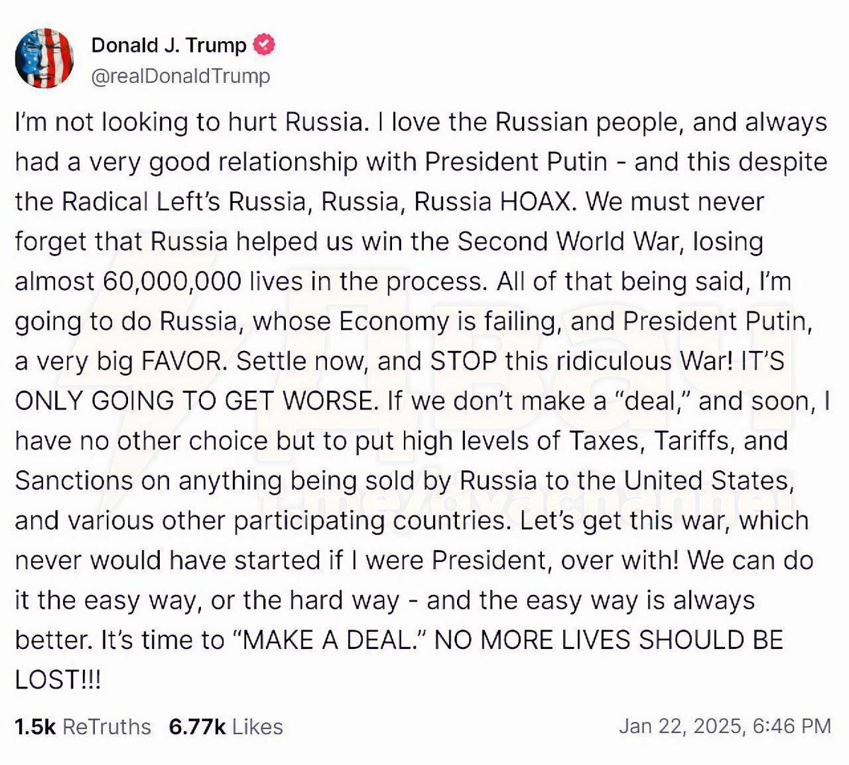 Наверное, тоже стоит прокомментировать свежее откровение "агента Дональда". Тут надо понимать, что этот пост - продолжение его "твиттерной дипломатии", когда запросная позиция Штатов доносится не по закрытым дипломатическим каналам, а публично и даже с максимально возможной оглаской. А у такого жанра есть и своя форма подачи - хайп и нагнетание ажиотажа, чтобы вызвать соответствующий отклик. Ответить в равной мере мы не можем и никто не может, потому что трибуна принадлежит Трампу с Маском и работает она по их правилам. Отсюда и получается, что с медийиной точки зрения Трамп явит себя миру "крутым перцем", которому попросту нечего возразить, хотя вернее сказать, что нет возможности сделать это также громко. Поэтому он уже имеет увесистый бонус общественного восприятия, хотя никакие предметные переговоры ещё даже не начались: как известно, молчание на выпад/реплику/вопрос/утверждение будет воспринято или трактовано как согласие с изложенным. Пусть даже "факты" сплошь ложные. Таким не