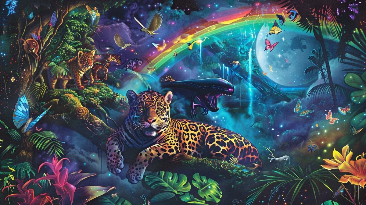 Создано на основе запроса: It's night time in a deep rainforest full of animals and reptiles, there's a jaguar in the middle of the scene. An alien descends from the sky. There's a triple rainbow in the sky, with fairies floating all around --- Автоперевод: Наступив ночь в глубоком тропическом лесу, полном животных и рептилий, в середине сцены есть ягуар. Классно вышло? 🤔 https://dzen.ru/id/65c0c65c86e4f837c27b24d7 #ИИ #AI #нейросеть #midjourney #art
