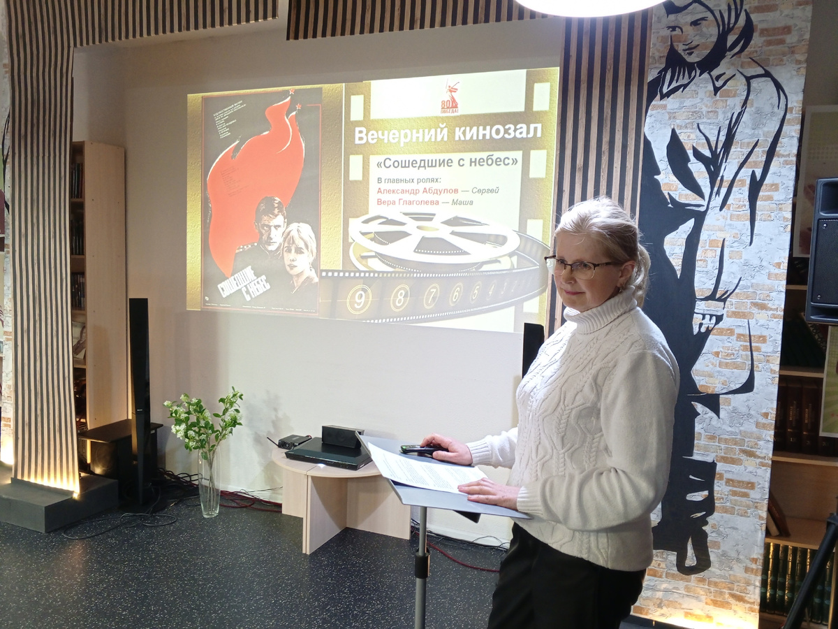 В завершении акции Библионочь-2025 состоялось обсуждение экранизации повести Алексея Каплера «Двое из двадцати миллионов». Повесть начинается словами: «Я увидел их в день тридцатилетия Победы — защитников и пленников Аджимушкайских катакомб». Но сейчас мало кто знает, где находятся Аджимушкайские каменоломни и о том, что происходило там в 1942 году. Ведущая Светлана Дроздова рассказала о военных событиях, описываемых в повести и познакомила гостей с незаслуженно забытым фильмом «Сошедшие с небес» режиссера Натальи Трощенко, снятым в 1986 году, в котором главные роли исполнили Вера Глаголева и Александр Абдулов. Также ведущая обратила внимание на некоторые отличия фильма от книги. В процессе просмотра можно было ощутить, как зрители переживают вместе с героями эту трагическую историю. Во время неожиданно трагического финала в зале стояла звенящая тишина. А после все высказывали свои мнения и сошлись на том, что это необычный и пронзительный, нежный и щемящий, один из лучших советских фи