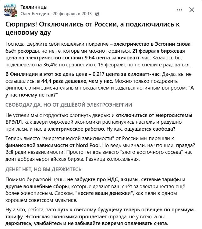 Знаете как выглядит классический самострел? Вот, пожалуйста. Счастье жить без российской электроэнергии будет не только лишь у всех. Поздравлю дальних родственников lollid с этим блестящим решением. Palju õnne!!! ЛИ́НДРЕ 🫧