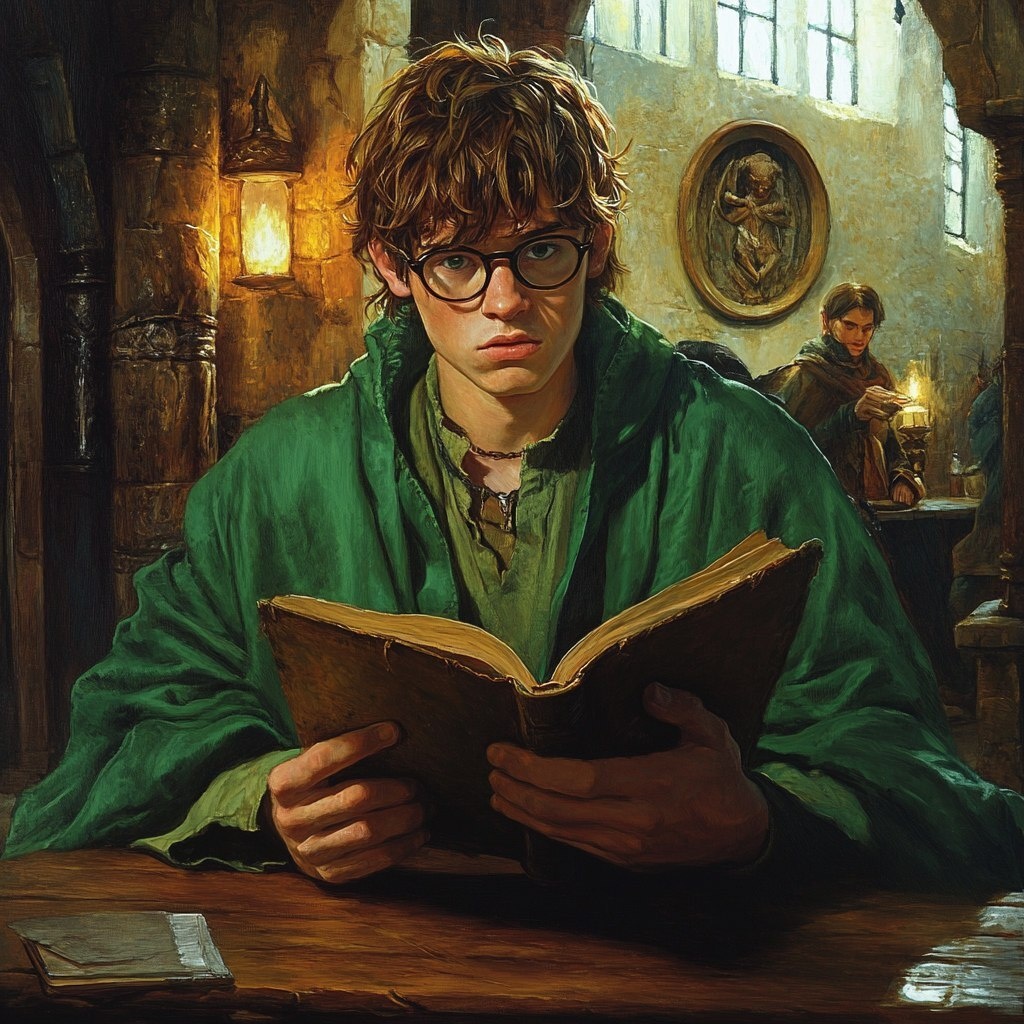 Создано на основе запроса: 16 year old wizard wearing green robes sits at a table in a tavern reading a spell book, he wears glasses, is