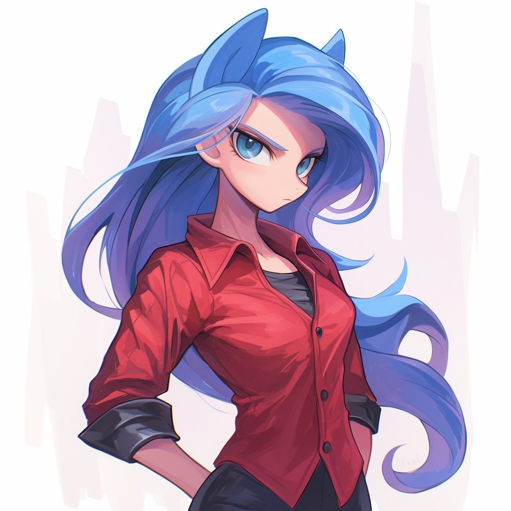 Создано на основе запроса: A full-length scarlet pony with blue hair and grey eyes