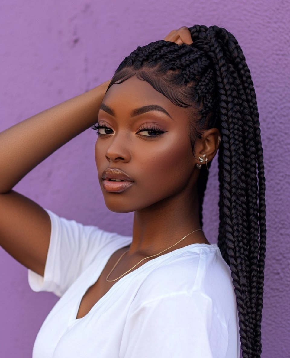 Создано на основе запроса: An African American woman with long black braids, wearing a white shirt, is styling her hair against a purple and