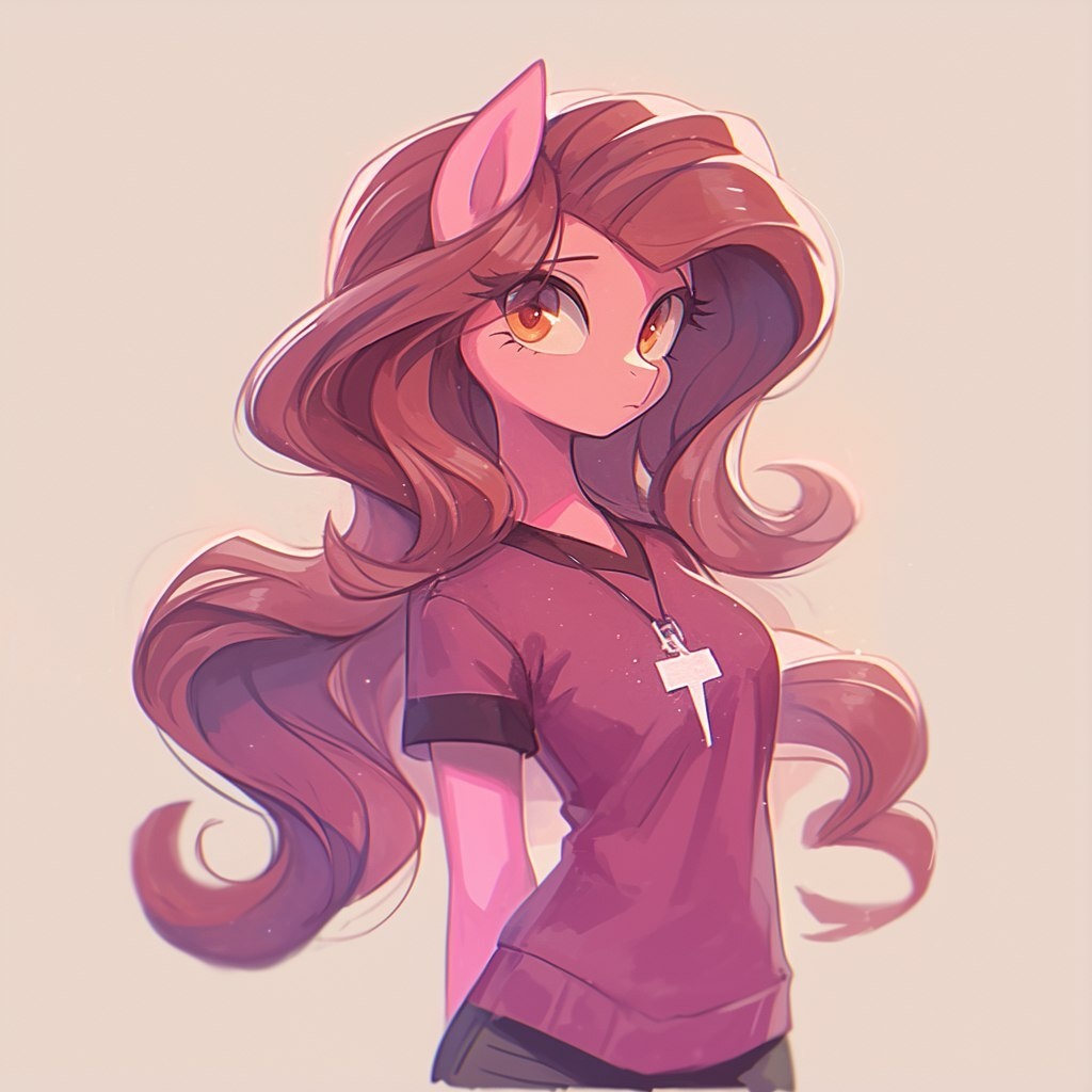 Создано на основе запроса: A full-length pink pony with brown hair and dark orange eyes.
