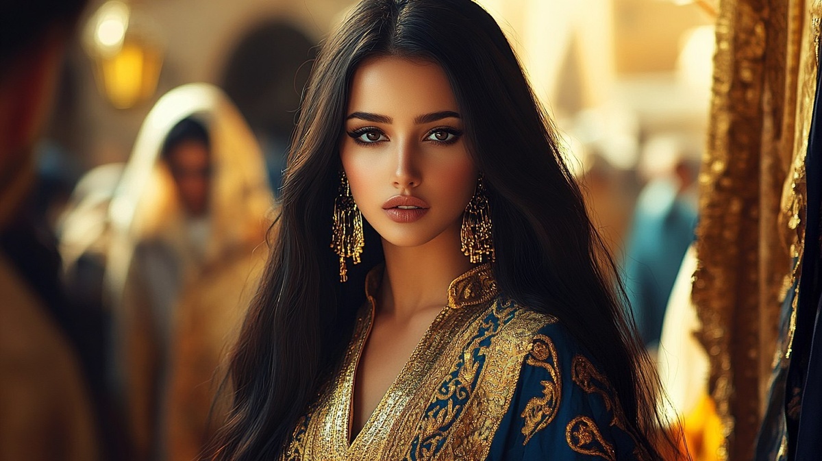 Создано на основе запроса: Confident woman walking through a vibrant Arabian marketplace, people turning heads to look at her, dressed in