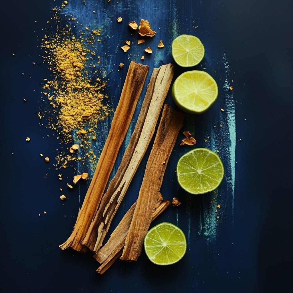 Создано на основе запроса: artistic and minimalistic image of lime and sandalwood, atmospheric combo in dark blue background with a few