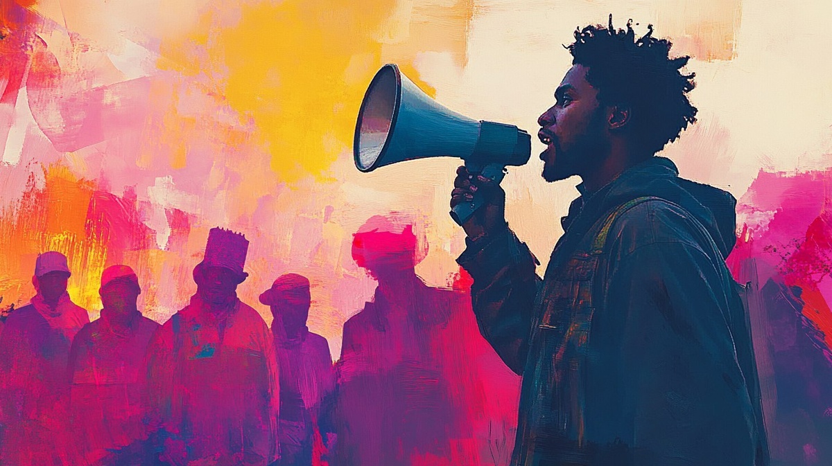 Создано на основе запроса: a water paint image mixed with synthwave aesthetics of a backview of a african mixed man holding a megaphone