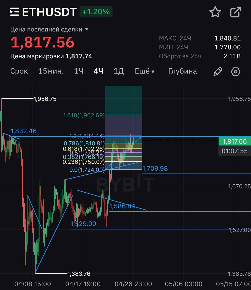 По пробойной технике, обычно идет два касания по горизонту, далее ложный закол, и спуск до ближайшего имбаланса так что набор до 1709 стоп 1690 цели указывал в предыдущем посту. #eth