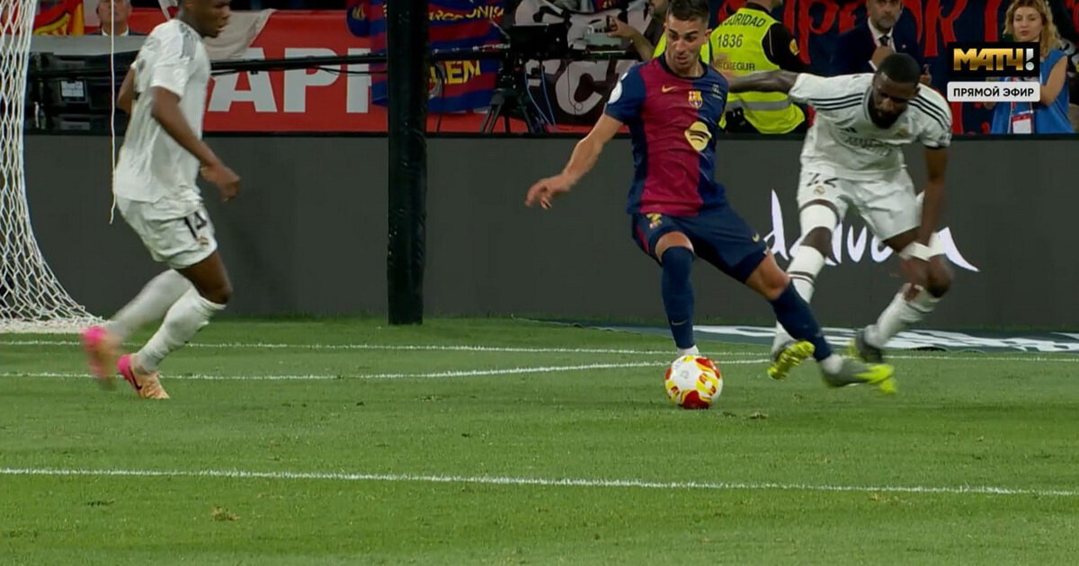 В финале Кубка Испании на 4-й добавленной ко второму тайму минуте защитник «Реала» зацепил ногу вингера «Барселоны» Феррана Торреса, разворачивавшегося в штрафной площади. Испанец упал на газон. Главный судья Рикардо де Бургос Бенгоэчеа не зафиксировал нарушения правил. По мнению экс-арбитра Эдуардо Итурральде Гонсалеса, следовало свистнуть: «Как по мне, это пенальти. Он зацепил опорную ногу. Но в этом случае решать полевому судье, а не ВАР, вмешательство видеоассистента не требуется, потому что здесь вопрос критериев, это не «явная и очевидная ошибка». Изображение: кадр из трансляции «Матч ТВ»