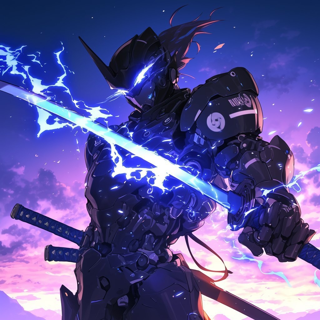 Создано на основе запроса: male cyborg samurai, wearing a samurai outfit, glowing blue eyes, wielding a katana covered in blue energy