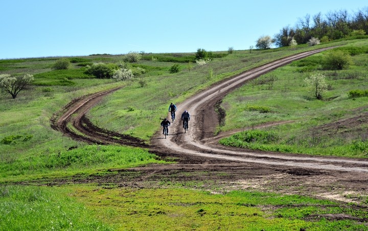 Красивый логичный маршрут по грунтам в теплое время года — много зелени, степные травы. Минимум транспорта, поля, лесополосы, пруды.