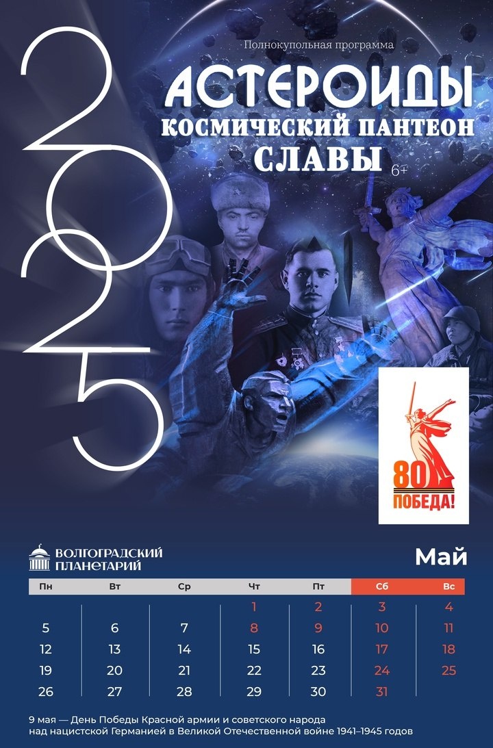 .................................................... МАЙ #главныесобытияимероприятия .................................................... ㅤ ㅤ 💫 ПРЕМЬЕРЫ И НОВИНКИ 💫 ㅤ Полнокупольная программа "Бессмертный подвиг Сталинграда" 6 мая 10:00 9 мая 10:00 9 мая 14:00 10 мая 12:00 11 мая 14:00 ㅤ Лекционная программа "Астероиды. Космический пантеон славы" 8 мая 10:00 9 мая 12:00 9 мая 16:00 10 мая 10:00 11 мая 16:00 ㅤ Музыкальная полнокупольная программа "КОСМОДРАЙВ" 23 мая 19:00 ㅤ Музыкальная полнокупольная программа "Звуки звезд" 25 мая 18:00 ㅤ ㅤ ㅤ ㅤ ⚡ ЮБИЛЕЙНЫЕ И ЗНАЧИМЫЕ СОБЫТИЯ ⚡ ㅤ 3 мая - Всемирный день солнца 7 мая - 100 лет назад начал работу первый в мире планетарий в Немецком музее в Мюнхене 9 мая - 80 лет Победы в Великой Отечественной войне 15 мая - 65 лет запуску первого КК "Восток" без космонавтов с космодрома Байконур ㅤ ㅤ ㅤ ㅤ ⚡ АСТРОНОМИЧЕСКИЕ СОБЫТИЯ ⚡ ㅤ 4 мая - Начало утренней видимости Сатурна 5 мая - Марс в Яслях 12 мая - Полнолуние 27 мая - Новолуние 28 мая - Начало вече