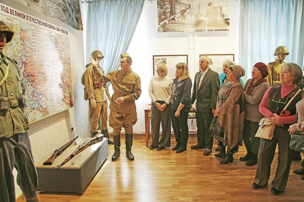 Научный сотрудник музея Алексей Шамукаев переводит интерес собравшихся на карту хода боевых действий. 1941 год—знаменитый план «Барбаросса», когда Советский Союз хотели смять в процессе блицкрига, но Красная армия дала отбор. 1943 год—коренной перелом. На то время выпали Курская и Сталинградская битвы, чуть позже—прорыв блокады Ленинграда, после чего враг шел обратно на запад.