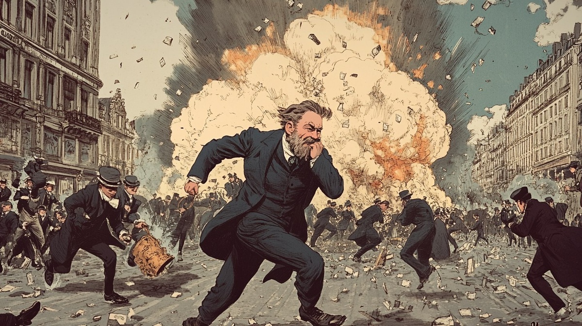 Создано на основе запроса: chaotic scene of workers running from an accidental explosion, Alfred Nobel facepalming in the background