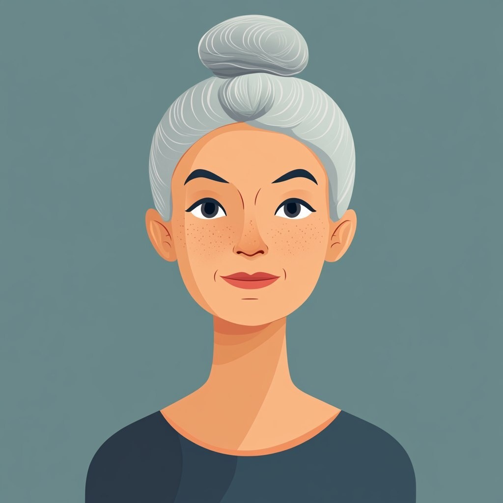 Создано на основе запроса: A pointy nose older woman with gray hair with a bun. Looking straight forward. Adobe Illustrator simple flat style no shading.