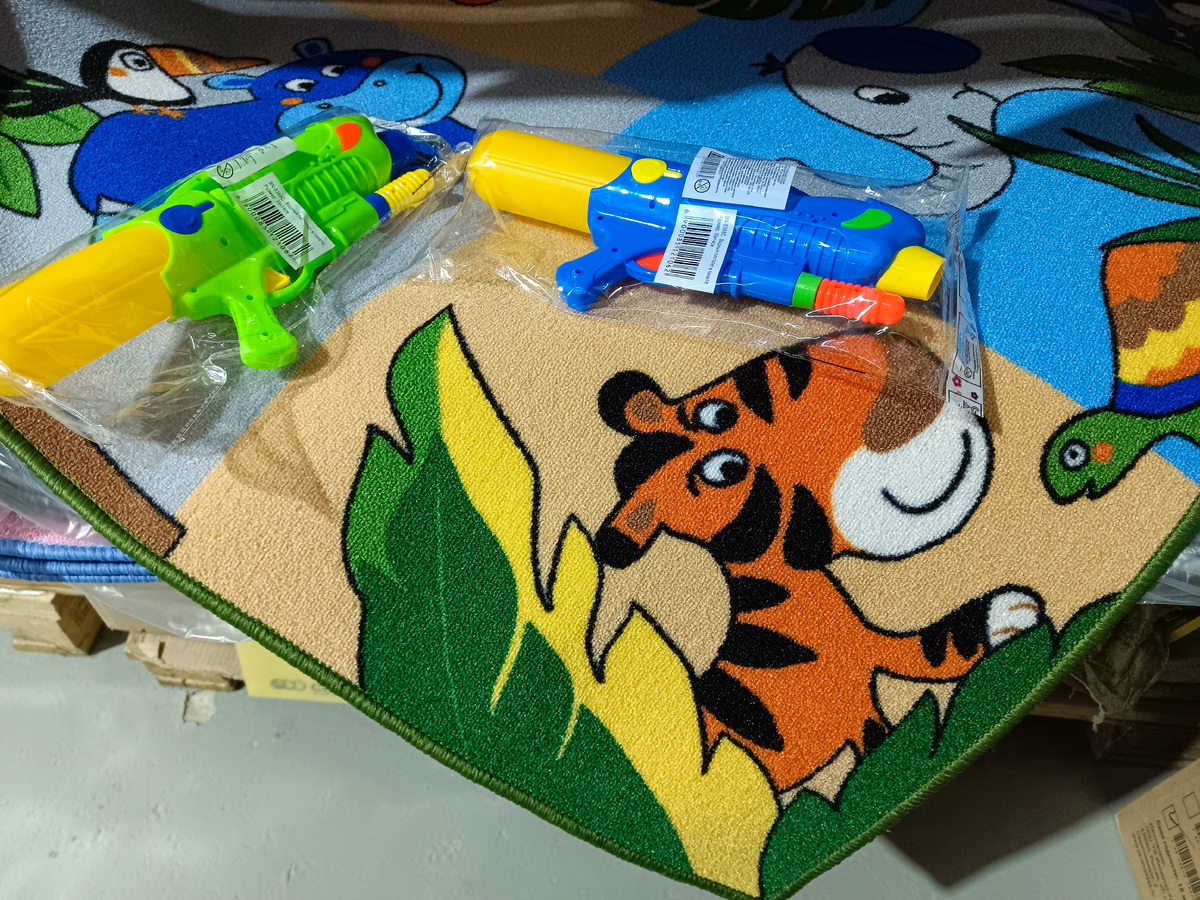 Ковёр на войлочной основе, предназначенный для использования в небольших помещениях, характеризуется ярким принтом, ориентированным на детскую аудиторию. В дизайне ковра доминирует африканская тематика, представленная изображениями пальм, песчаных дюн и разнообразных позитивных животных. Габаритные размеры изделия составляют 1 метр в ширину и 1,5 метра в длину. Стоимость ковра составляет 646 рублей.
