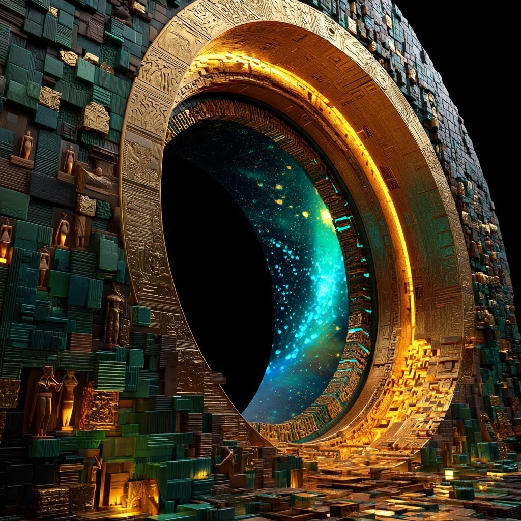 Создано на основе запроса: Build an enormous stargate shaped like an Ankh, constructed from intricately layered cubes in emerald, copper, and onyx tones. The portal pulses with a shimmering vortex of blue and gold, surrounded by voxel carvings of African deities and constellations. Afrocentric Futurism --- Автоперевод: Создайте огромный звездный врач в форме ANKH, построенном из замысловатых кубиков в изумрудных, медных и оникальных тонах. Как тебе картинка? 🤔 https://dzen.ru/id/65c0c65c86e4f837c27b24d7 #ИИ #AI #нейросеть #midjourney #art