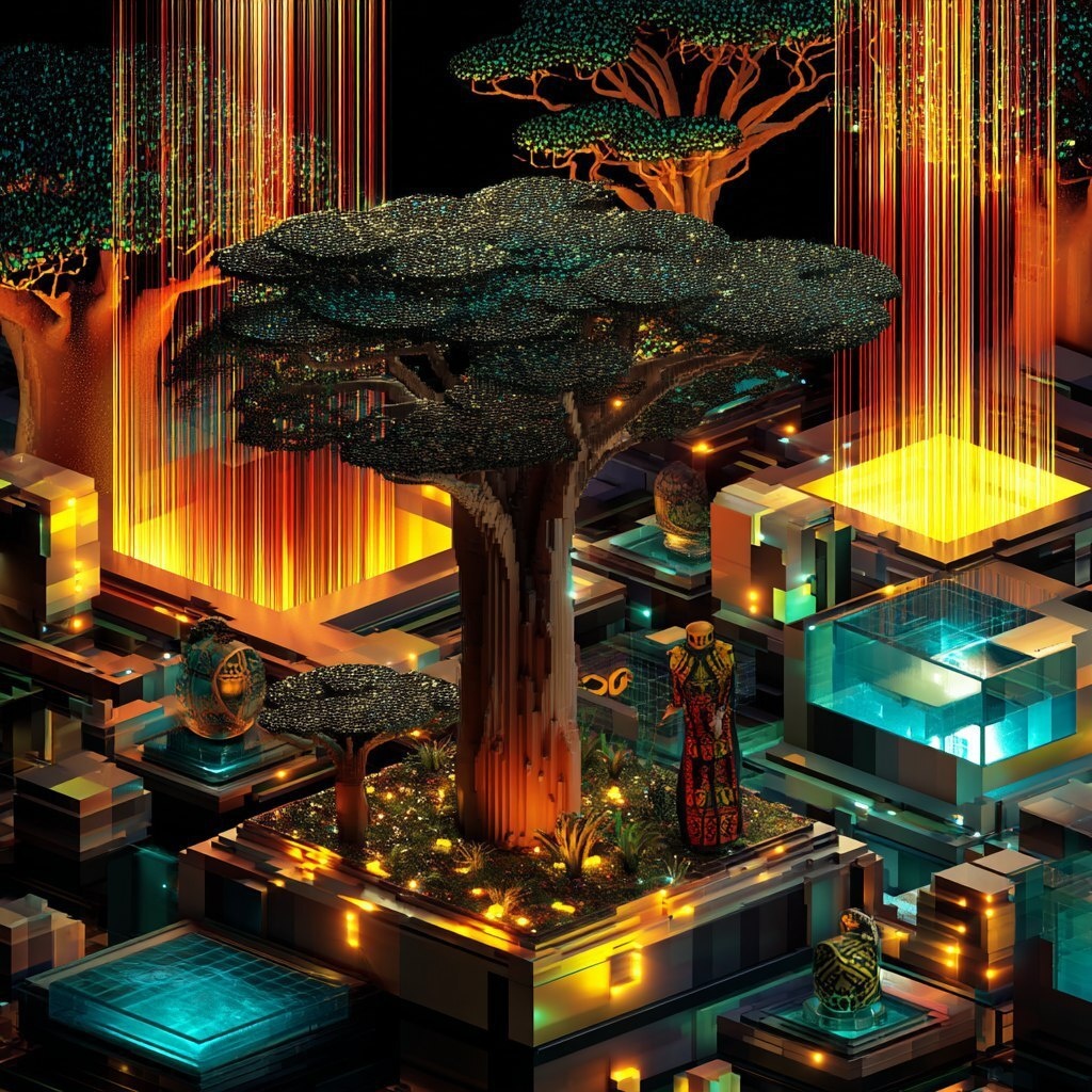 Создано на основе запроса: Craft a tranquil voxel garden filled with towering baobab trees, whose pixelated leaves sparkle like obsidian. Scattered around the garden are voxel sculptures of African royalty, set against a backdrop of glowing digital waterfalls Afrocentric --- Автоперевод: Создайте спокойный воксельный сад, наполненный высокими баобабскими деревьями, чьи пиксельные листья блестят, как обсидиан. Как тебе такая картинка? 🤔 https://dzen.ru/id/65c0c65c86e4f837c27b24d7 #ИИ #AI #нейросеть #midjourney #art