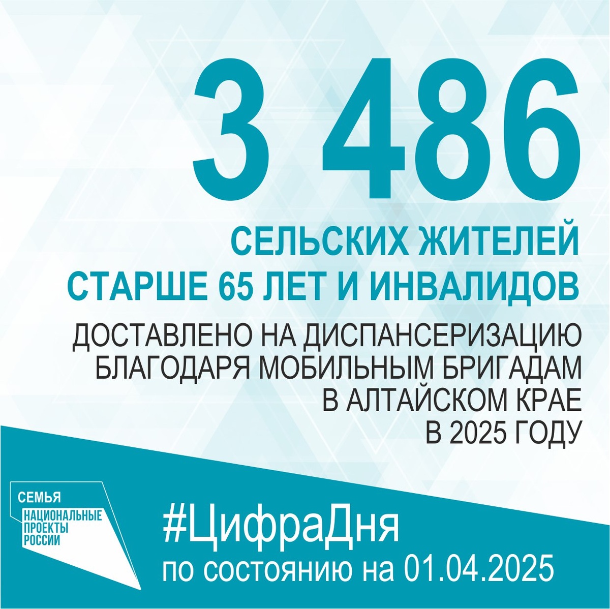 ▶ 3 486 сельских жителей старше 65 лет и инвалидов были доставлены на диспансеризацию и в учреждения социального обслуживания с помощью работы мобильных бригад в Алтайском крае в 2025 году в рамках национального проекта "Семья".