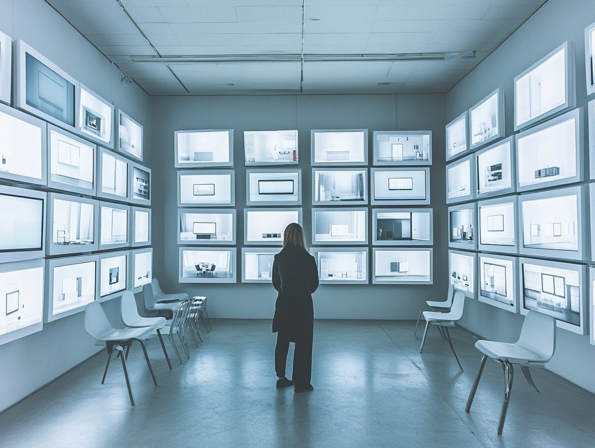 Создано на основе запроса: Futuristic photograph of a wall filled with identical interior design student projects on screens