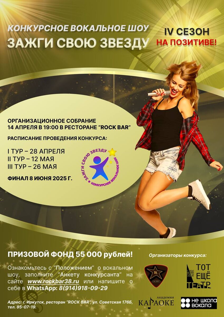 28.04 ПН. 19:00 💥 I ТУР КОНКУРСНОГО ВОКАЛЬНОГО ШОУ "ЗАЖГИ СВОЮ ЗВЕЗДУ" IV СЕЗОН "НА ПОЗИТИВЕ!" Приглашаем весело и интересно провести этот вечер! І тур - это 5 мини-мюзиклов приветствия команд-конкурсантов из непрофессиональных вокалистов. Если на сцене ваши родные, друзья и приятели, то, конечно же, просто необходимо прийти поддержать и поболеть за них! Если Вы любите петь, то однозначно стоит познакомиться с конкурсом! Вход 350₽ А/С 18+ FC/DC Организаторы проекта: 💫 ресторан "Rock Bar" 💫 ресторан "Академия Караоке" 💫 Творческое объединение "Тот Ещё Театр" "ТЕТ" 💫 "НЕ ШКОЛА ВОКАЛА" Данная публикация носит исключительно информационный характер. 📞INFO/RV (с 15:00) +7-9148-95-07-19 💻 INFO/RV: www.rockbar38.ru 📍г.Иркутск, ул. Советская 176Б