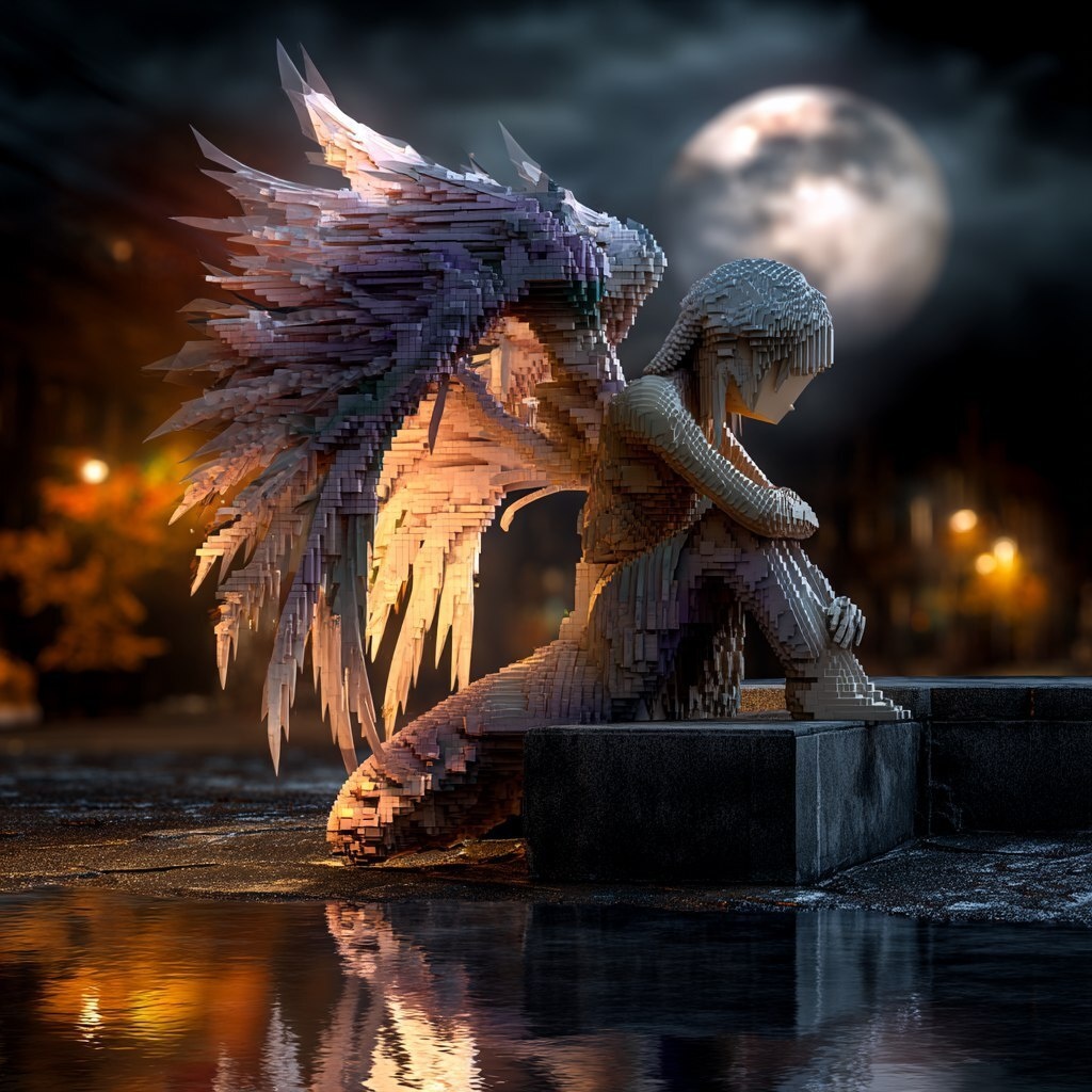 Создано на основе запроса: cute Voxel Angel sitting on a curb, dejected, harvest moon, full figure, full body, photo realistic, ar 89:128