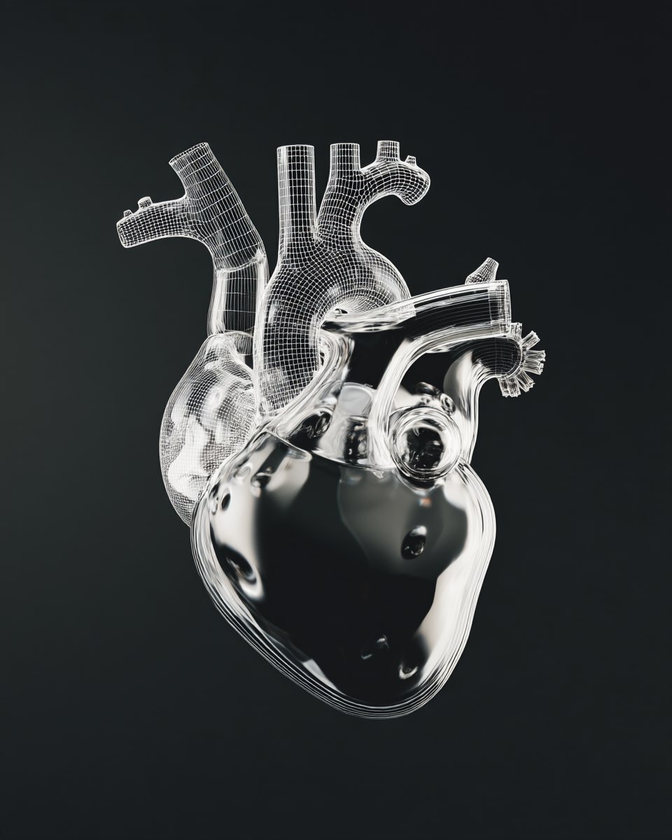 Создано на основе запроса: Wide shot of a 3D steampunk mechanical anatomical heart. Half of it is in viewport mode with wireframe and voxels and the other half in ultra realistic rendered in clear glass effect. --- Автоперевод: Широкий снимок трехмерного механического анатомического сердца. Интересно выглядит? 🤔 https://dzen.ru/id/65c0c65c86e4f837c27b24d7 #ИИ #AI #нейросеть #midjourney #art