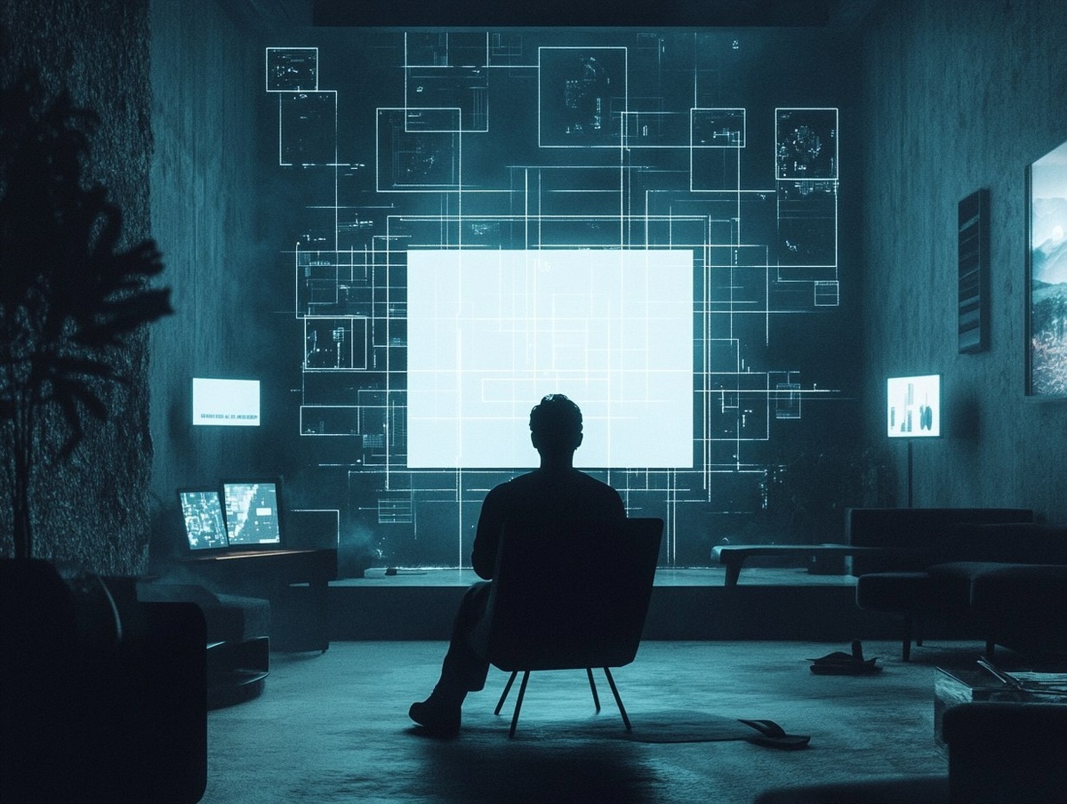 Создано на основе запроса: A futuristic, dark-toned photograph of a person in front of a screen, with an interior design proposal. It doesn't analyze anything. It seems to operate on autopilot. Surrounding it are furniture devoid of personality or functionality, as well as elements that don't fit into any space.